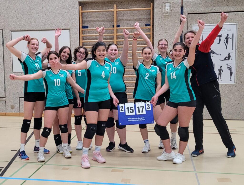 Die Freude nach diesem Sieg war hundert Mal grösser als wenn wir locker mit 3:0 gewonnen hätten. Ein richtig cooler Lehrblätz, denn aufgeben im Volleyball lohnt sich nie! Ja und das „Täfelisiegerfoto“ können wir dieses Mal liefern.